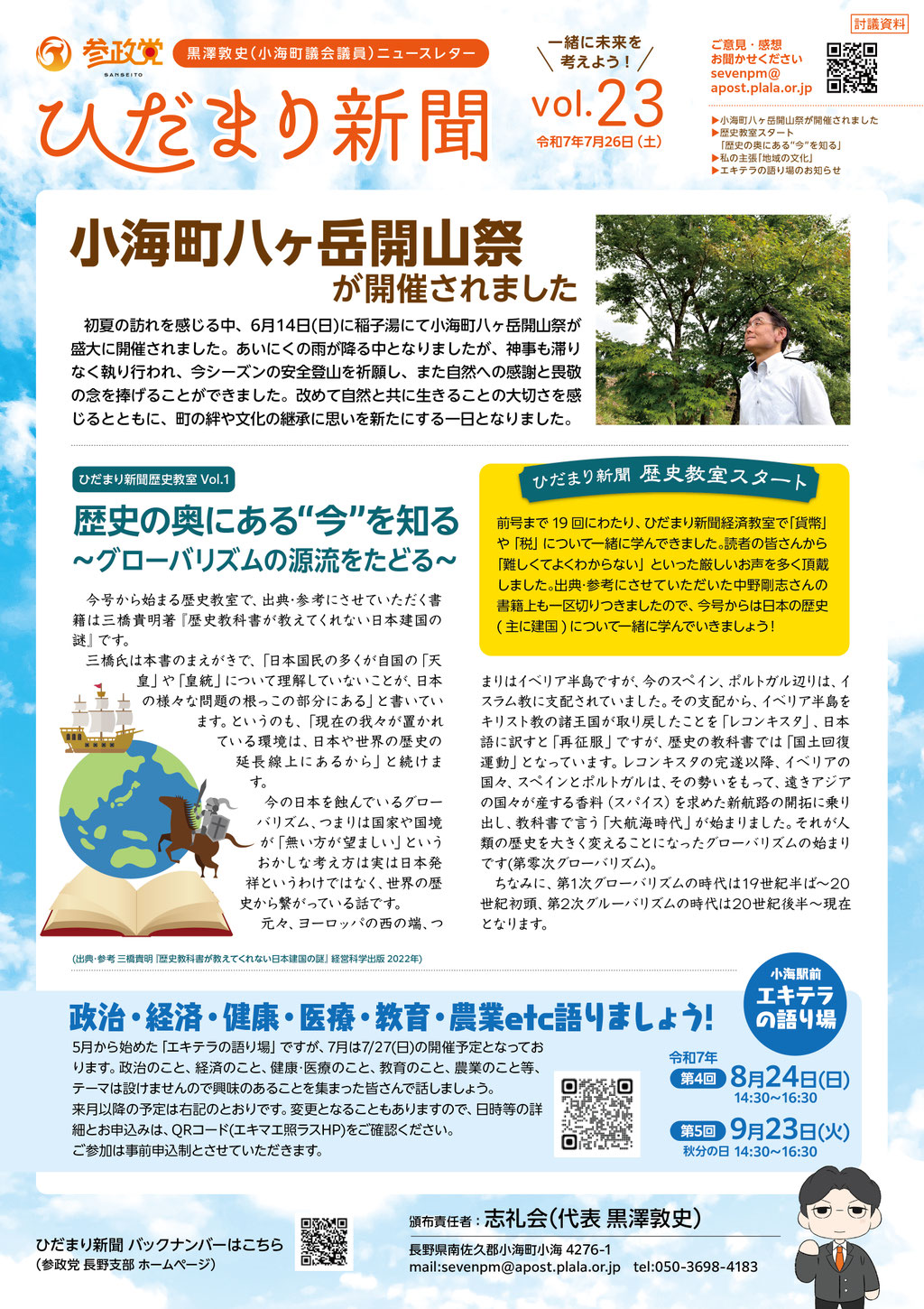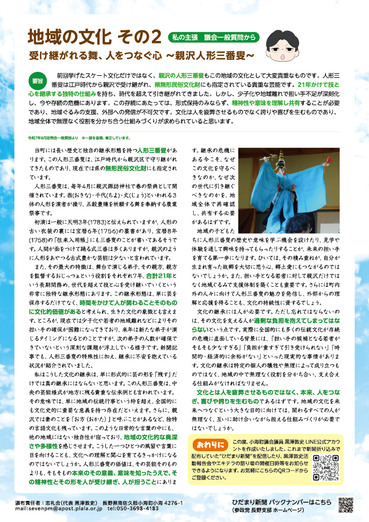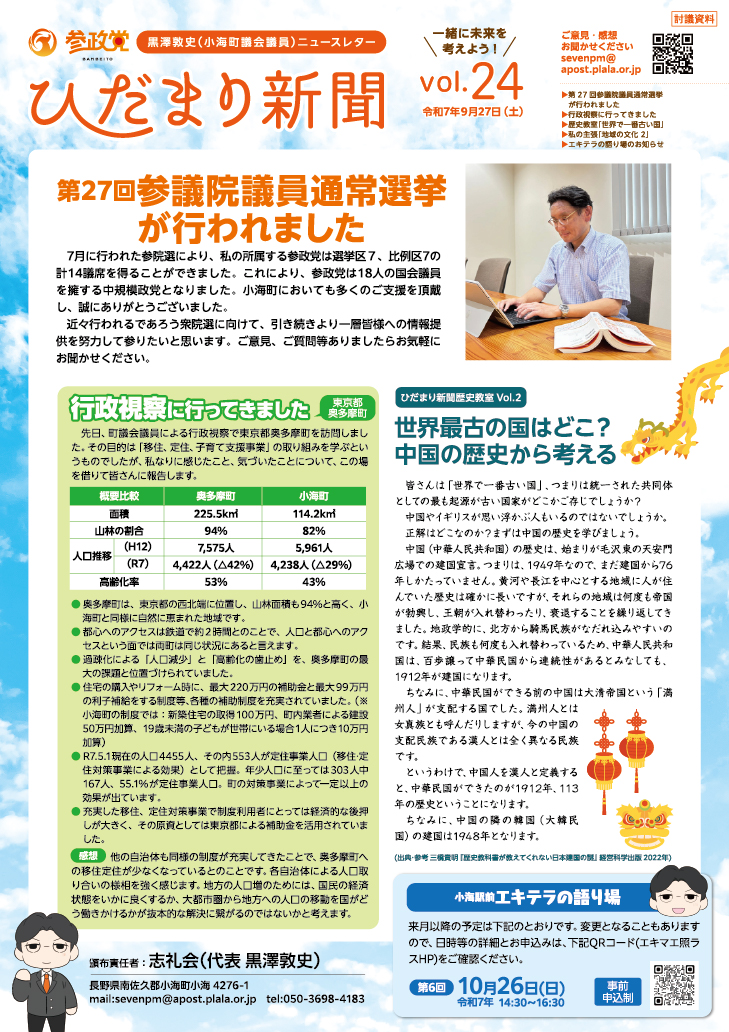 町議会議員となってまもなく、みなさんに町の状況、私の考え、みなさんからのご意見などの紹介をするひだまりのような居心地の良い場所を目指して、「ひだまり新聞」を発行しています。
